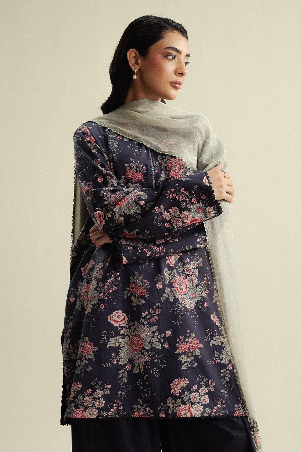 A blue shirt adorned with a vibrant print, paired with a printed trouser and a tuscan blue dupatta that deepens the palette with subtle sophistication.