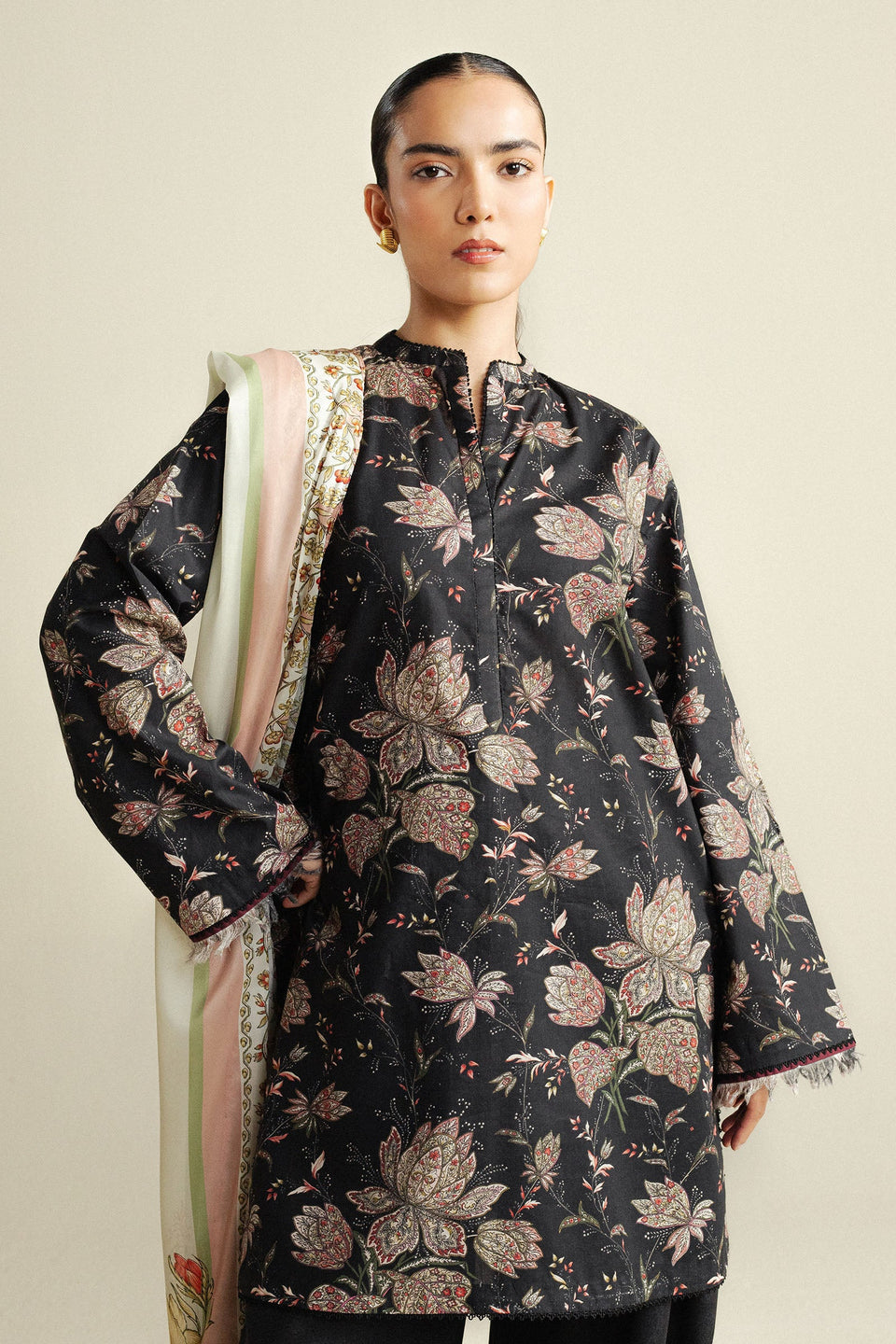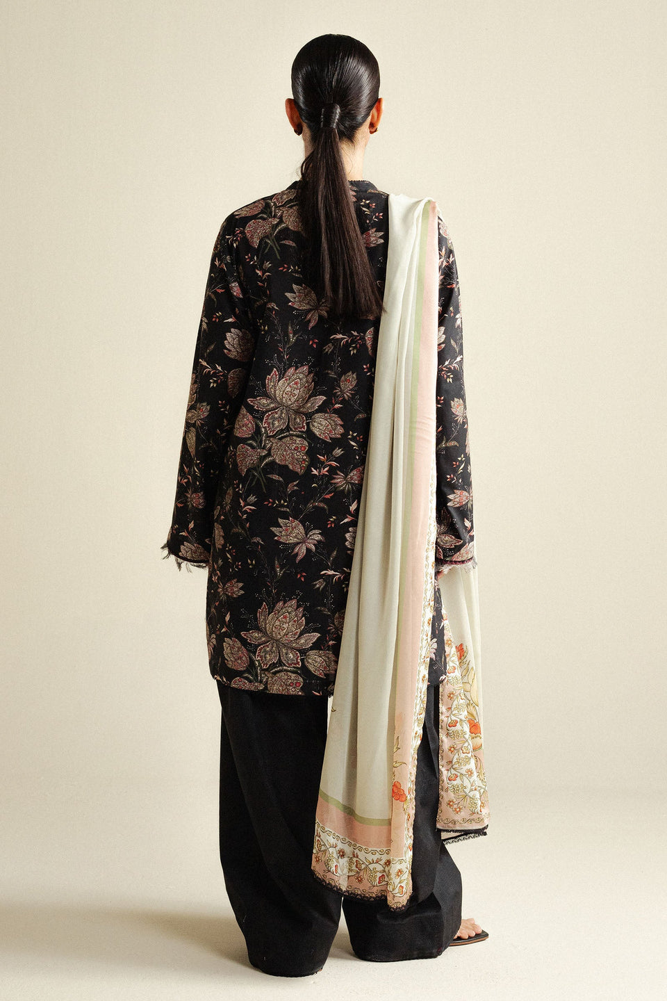 A bold black shirt paired with a printed trouser and a soft coffee beige dupatta, balancing depth with warmth.