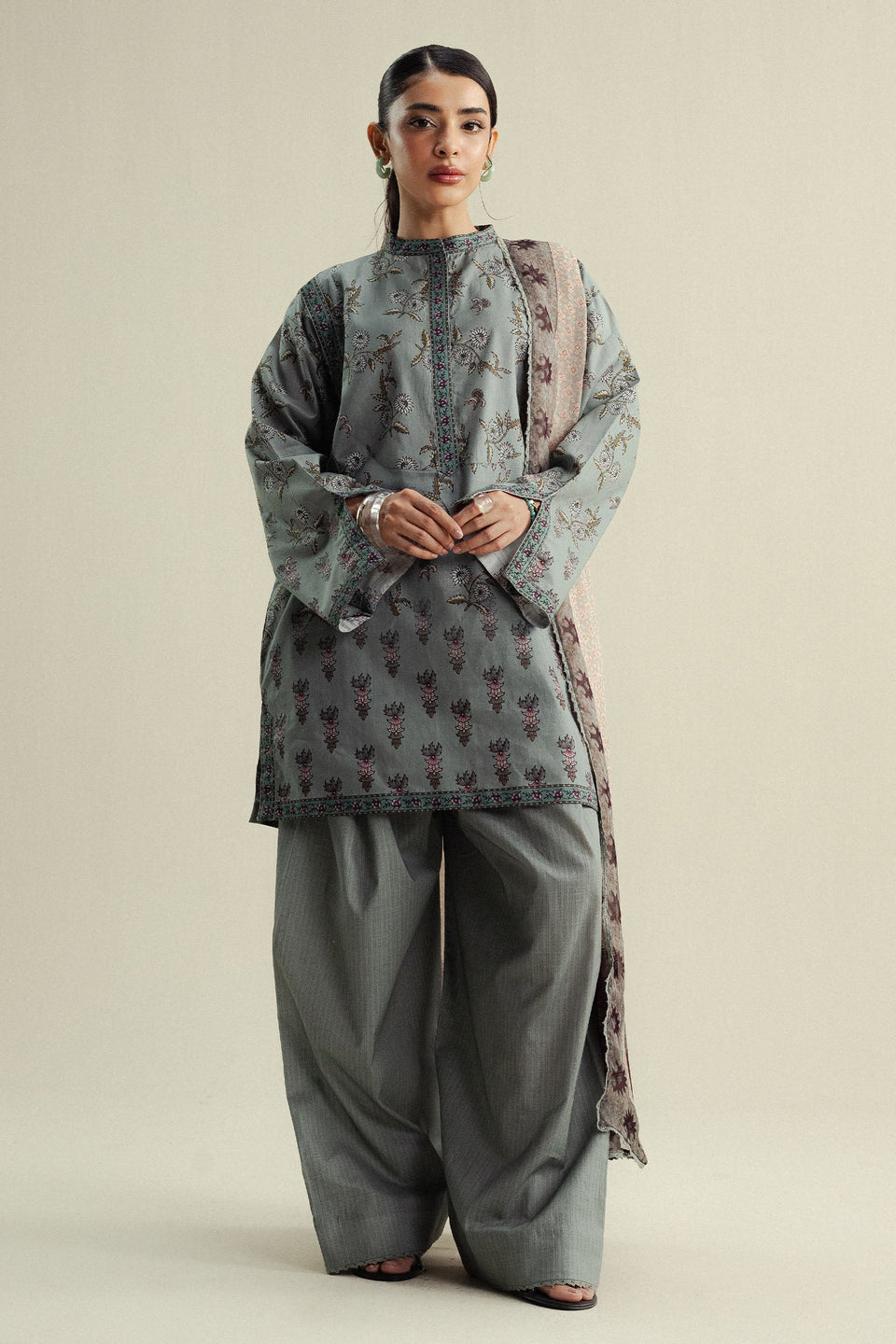 A soft mist green shirt paired with a plain trouser and a pastel gray dupatta, blending serenity with understated elegance.