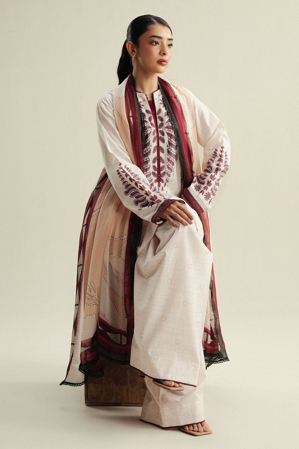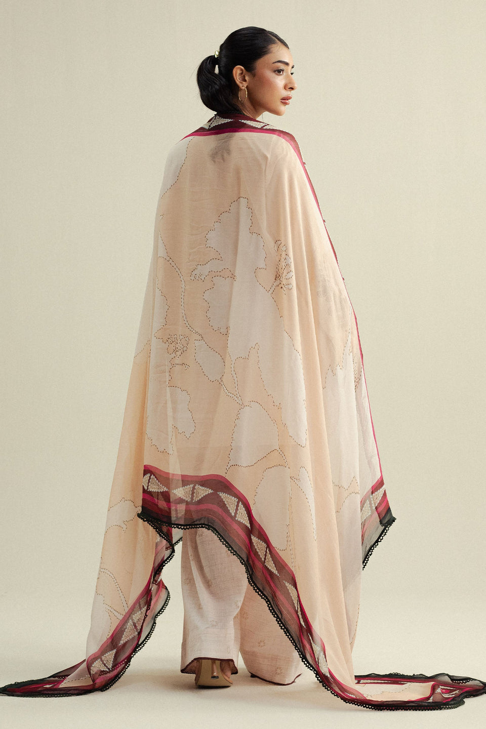 An elegant ivory shirt paired with a printed trouser and finished with a warm biscotti dupatta, bringing subtle charm and refined ease.