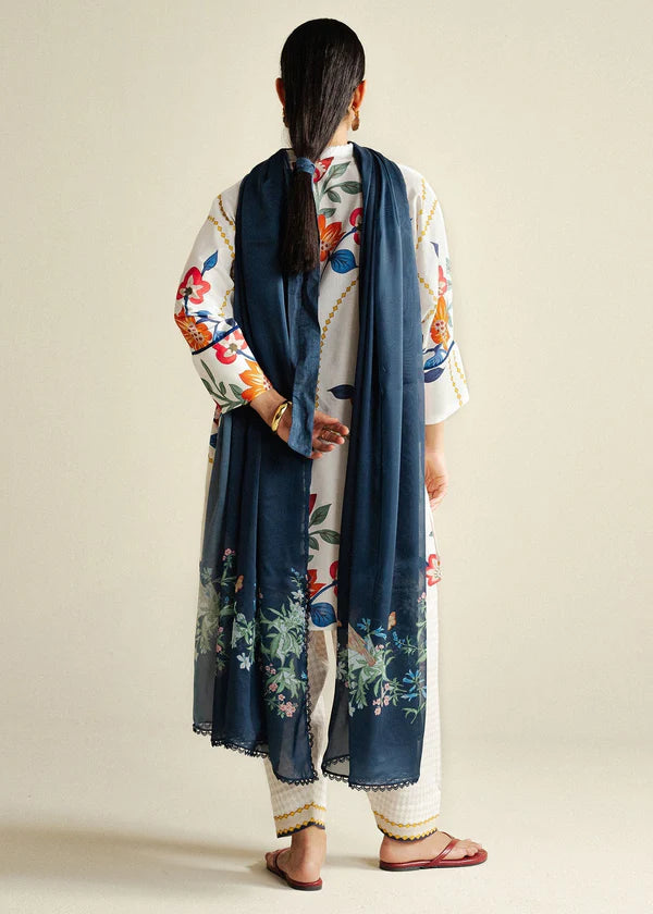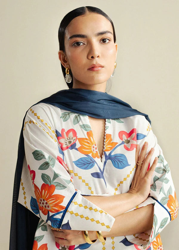 A crisp white shirt brought to life with a lively burst of multicolors, paired with a plain trouser and a bold cobalt blue dupatta that anchors the look with striking contrast.